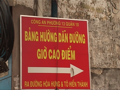 Toàn quận 10 có gần 100 bảng hướng dẫn đường giờ cao điểm được đặt ở những con hẻm thông giữa các trục đường chính với nhau - Ảnh: H.Hậu |