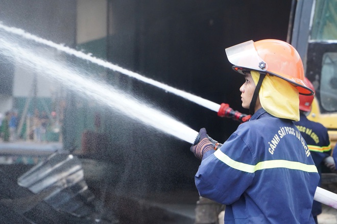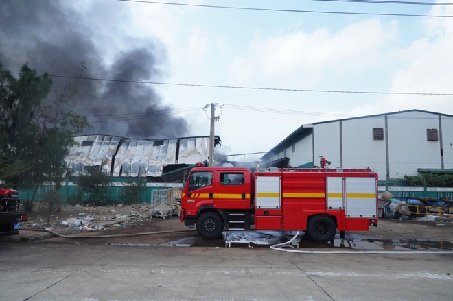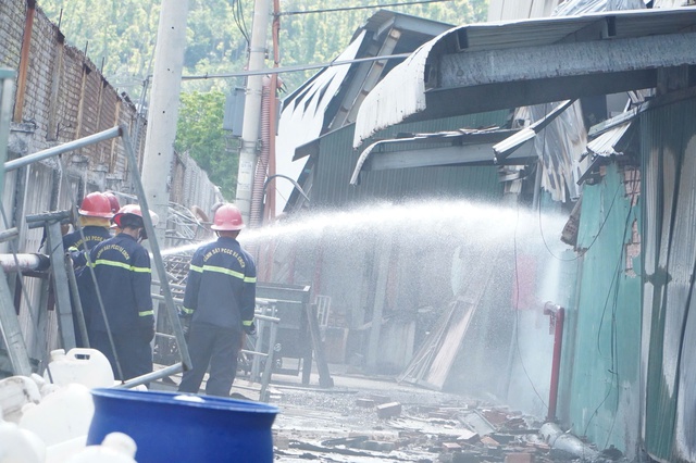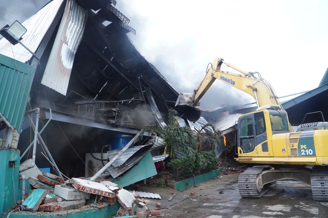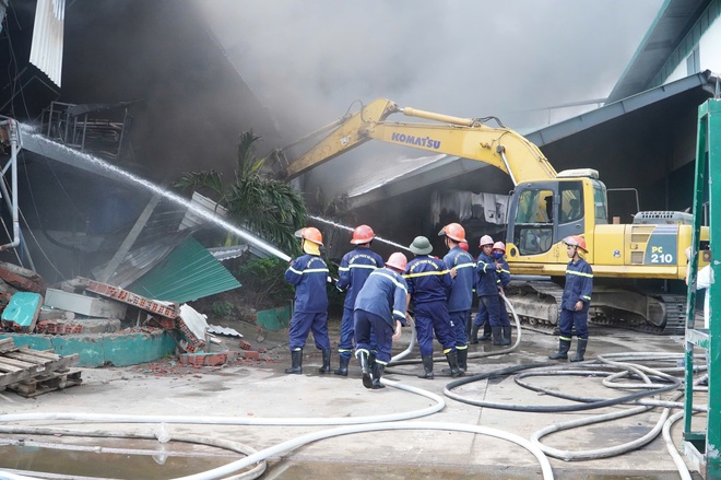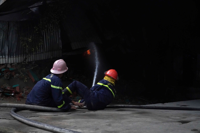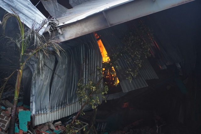 Dù đã được khống chế, không để cháy lan nhưng ngọn lửa vẫn đang âm ỉ bên trong nhà xưởng