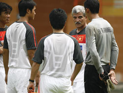 | HLV Calisto nói chuyện với Tấn Trường (bìa phải) sau buổi tập sáng qua - Ảnh: Bạch Dương |