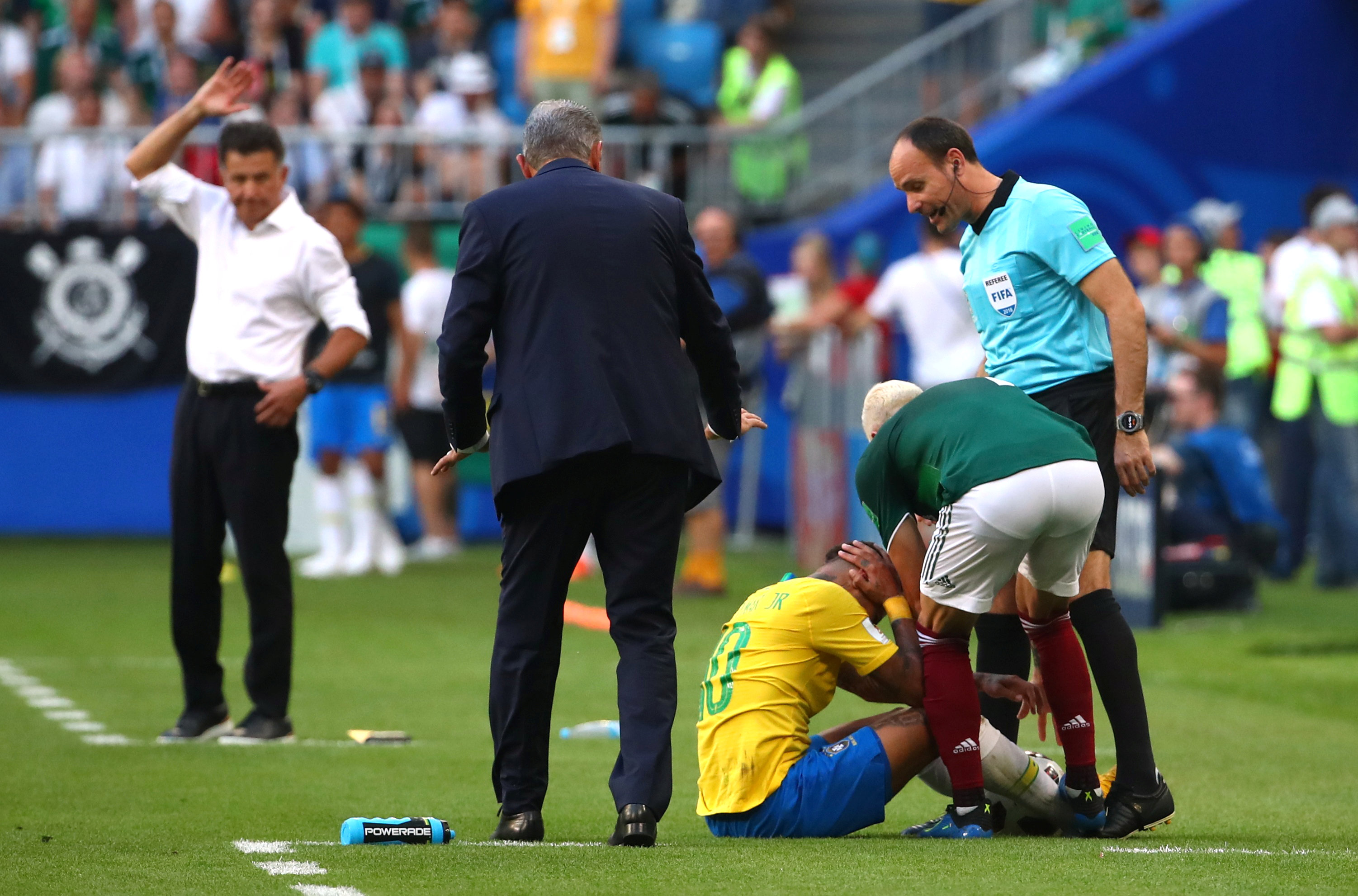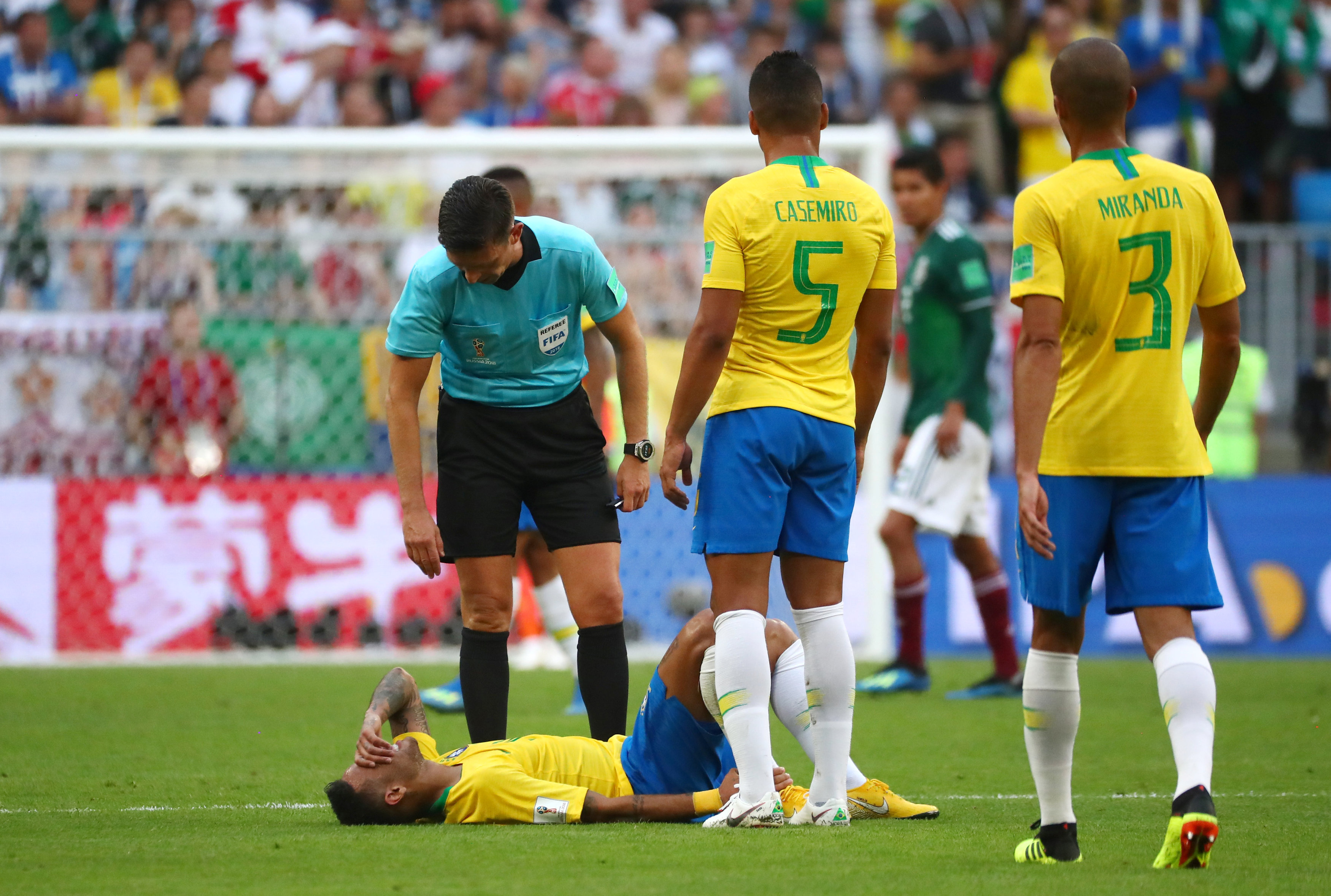 Trong những lần ngã của Neymar, tình huống tốn nhiều thời gian và tranh cãi nhất là khi trong lúc Miguel Layun nhặt bóng đã dùng tiểu xảo, giẫm lên cổ chân khiến tiền đạo Brazil quằn quại hết vài phút.