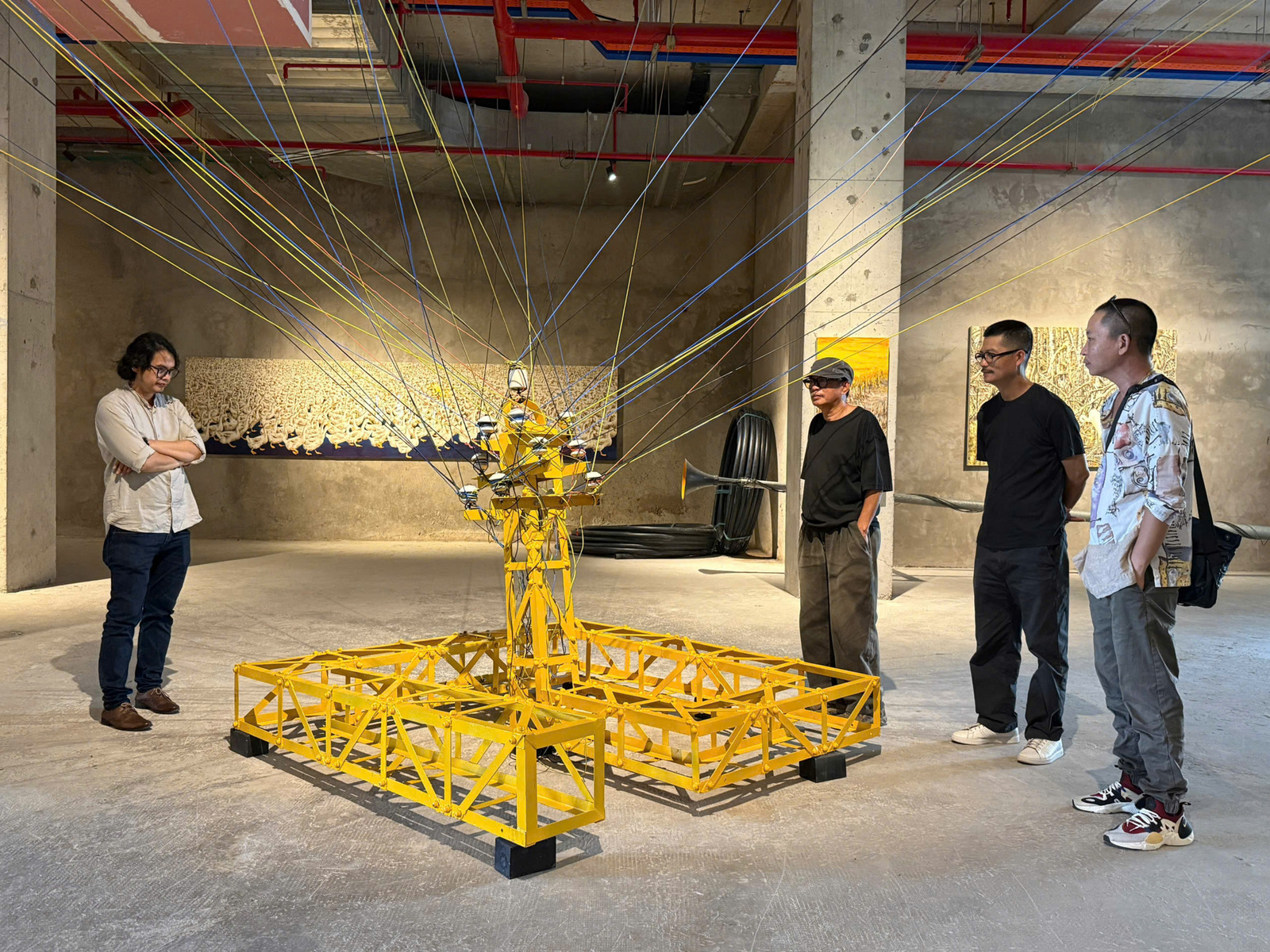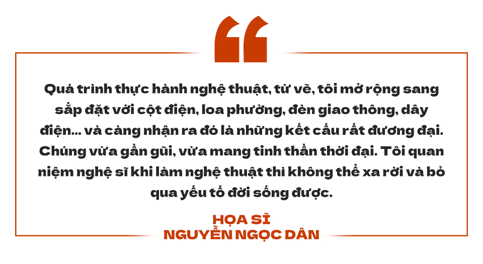Trước hết phải có cảm xúc, sau đó là sự kết nối với tạo hình hội họa. Dây điện, cột điện là những yếu tố rất đời thường, nhưng lại có khả năng tạo hình rất lớn. Quá trình thực hành nghệ thuật, từ vẽ, tôi mở rộng sang sắp đặt với cột điện, loa phường, đèn giao thông, dây điện… và càng nhận ra đó là những kết cấu rất đương đại. Chúng vừa gần gũi, vừa mang tinh thần thời đại. Tôi quan niệm nghệ sĩ khi làm nghệ thuật thì không thể xa rời và bỏ qua yếu tố đời sống được.