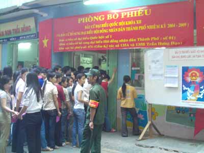 Cử tri chọn 3 ứng cử viên và bầu. Đại đa số tự viết phiếu, rất ít người nhờ viết giúp. “Tôi vừa bầu cho ông Thanh một phiếu. Nói chi thì nói, ông đã làm được nhiều việc cho thành phố...”, một người nguyên là lái xe nói. Sau một chút lưỡng lự, một nữ giáo viên cũng bầu cho ông một phiếu vì theo cô ông còn nhiều việc phải làm, ít nhất đối với những công trình lớn còn dở dang trong thành phố. Bầu xong, chuyện vãn, một ông cụ đọc Kiều: “Trăm năm trong cõi người ta/ Chữ tài chữ mệnh khéo là ghét nhau...” Tôi nghĩ theo cách dân gian- hiện đại: Mong sao các đại biểu kỳ này hội đủ 3T: Tài, Tâm, Tầm! TP.HCM Sáng 20.5.2007, giờ G đã đến. Ngay từ sáng sớm, xe tuyên truyền lưu động đã đi đến từng khu phố để tuyên truyền cho ngày bầu cử Quốc hội khóa XII. Mới 6h15, còn 45 phút nữa mới đến giờ bỏ phiếu, nhưng tại nhiều điểm bỏ phiếu, các cử tri đã có mặt. Họ hầu hết là những người cao tuổi. PV Thanh Niên Online có mặt tại một số điểm bỏ phiếu, ghi nhận không khí sôi nổi trong ngày này - ngày mà mọi công dân nước Việt Nam đi thực hiện nghĩa vụ đồng thời cũng là quyền lợi của mình: lựa chọn đại biểu ưu tú của nhân dân. Tại Trường THCS Dân lập Phú Mỹ (Đường Ngô Tất Tố, Q. Bình Thạnh), các cử tri đến sớm đang trò chuyện, bàn luận và chuẩn bị tham dự lễ khai mạc. Bác Nguyễn Văn Tạng, một cựu chiến binh cho biết: "Tôi đến đây cùng một số người bạn trong hội cựu chiến binh. Chúng tôi đến sớm để còn dự lễ khai mạc. Tôi cũng có một cháu gái đang học tại Đà Nẵng. Đợt này, tôi cũng động viên cháu về để làm nghĩa vụ của một công dân. Tối qua cháu vừa về đến. Tôi cũng vừa gọi điện về nhà để giục cháu ra sớm vì đây là lần đầu tiên cháu được đi bầu cử". Còn tại Phòng bỏ phiếu tại Trường tiểu học Nguyễn Thái Sơn (đường Huỳnh Tịnh Của, Q.3), không khí ở đây khá nhộn nhịp. Rất đông cử tri đã có mặt từ rất sớm để dự lễ chào cờ. 6h30 phút, bài Quốc ca vang lên. Tất cả những người có mặt đều nghiêm trang hướng về lá cờ Tổ quốc. Một buổi lễ khai mạc trang trọng diễn ra ngay sau đó. Phía ngoài sân chờ, các cử tri đến ngày một đông. Trên tay mỗi người là lá phiếu hồng. Bác Nguyễn Thị Minh, đã 83 tuổi, hôm nay đi bỏ phiếu cùng cháu gái. Bác cứ giữ chặt lá phiếu trên tay dù cô cháu gái đã mấy lần định cầm giúp. Bác không còn nhớ đây là lần thứ mấy mình đi bầu cử, chỉ nhớ là: "Tôi đã đi bầu cử Quốc hội nhiều lần rồi, lần nào tôi cũng dậy thật sớm và đi sớm". Cô cháu gái của bác còn kể thêm, đây là lần thứ hai chị đưa bà ngoại của đi bỏ phiếu. Lần nào, bà cũng mặc bộ đồ đẹp nhất của mình để đi bầu cử... Đúng 7h00, các cử tri xếp hàng lần lượt để làm thủ tục và bỏ phiếu bầu. Đây cũng là điểm bỏ phiếu được chọn để thực hiện ghi hình chương trình cầu truyền hình trực tiếp về ngày bầu cử Quốc hội của Đài Truyền hình Việt Nam.