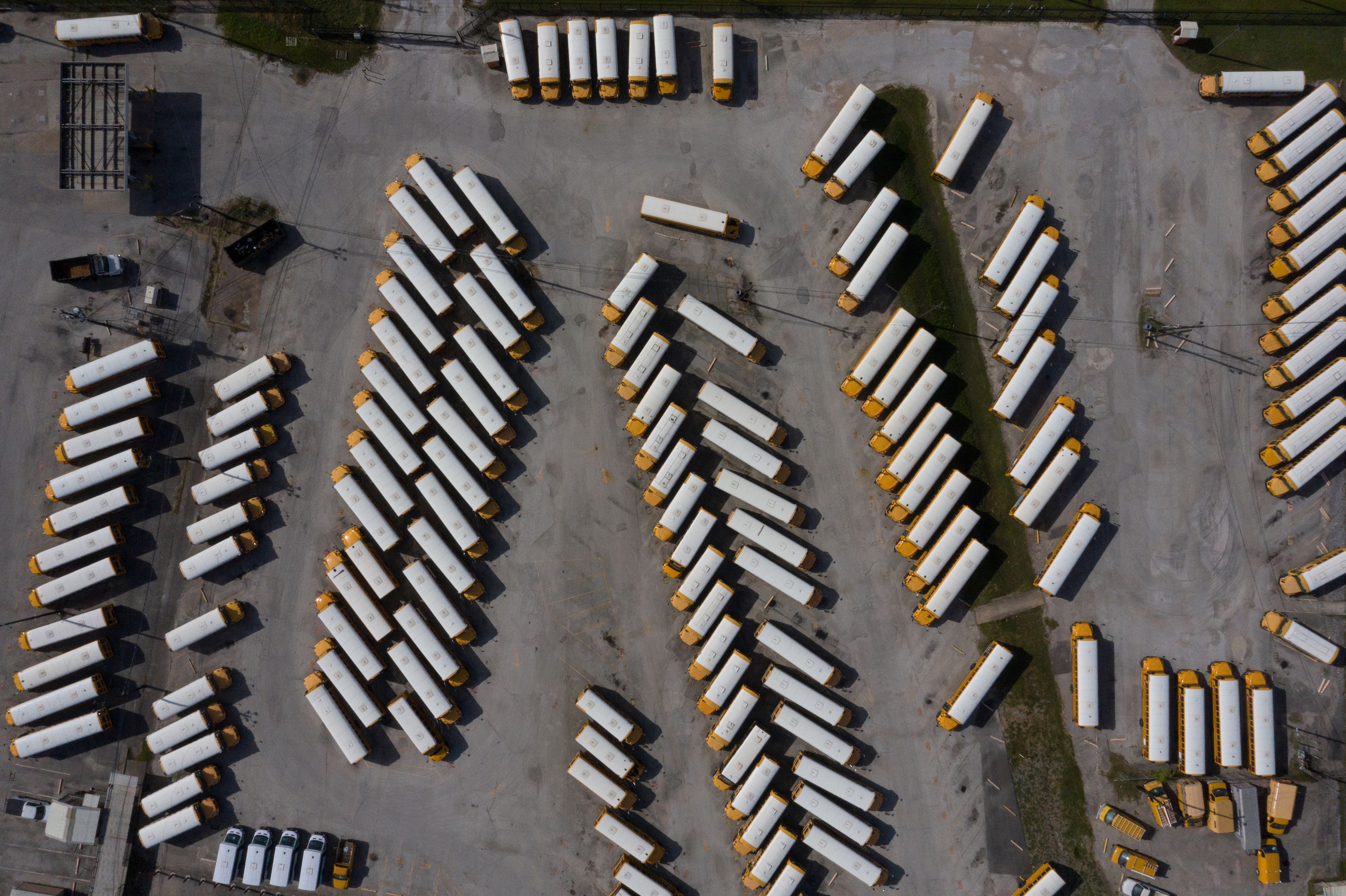 Xe buýt chở học sinh ở Mỹ đậu trong một bãi đậu vì không hoạt động trong nhiều tháng qua. Reuters |