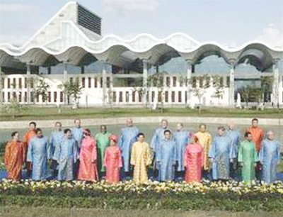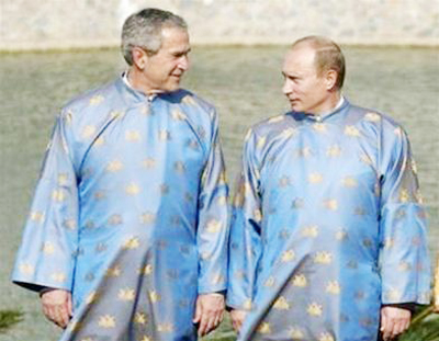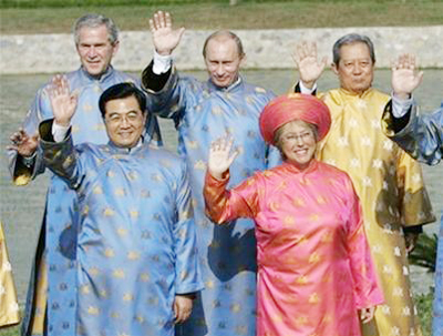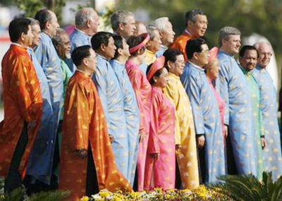 Chủ tịch nước Nguyễn Minh Triết trong bộ áo dài màu vàng đứng giữa các nhà lãnh đạo các nền kinh tế APEC. Việc mặc trang phục truyền thống của quốc gia đăng cai APEC ở buổi họp tổng kết đã trở thành một nghi thức truyền thống trong những lần tổ chức Hội nghị APEC.