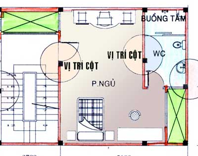 - Khi nhà có khoảng cách cột rộng thì độ cao của các dầm sẽ lớn tương ứng theo làm xấu không gian và phức tạp hơn cho kết cấu. Vì thế, nên bổ sung cột vào khoảng giữa để giảm khẩu độ nhưng phải đặt cột tại các vị trí có thể che giấu được bằng tường ngăn để không gian không bị vướng cột, ở đây giải pháp cụ thể là bố trí cột tại các điểm có ngăn phòng vệ sinh, cạnh giếng trời... để vừa tăng cường tính hợp lý về kết cấu vừa không bị lòi cột vào các không gian sử dụng. Việc “biến” cột này cần tiến hành đồng bộ và hợp lý từ trên lầu xuống dưới trệt, cột tại hai bên ô cầu thang, cột bên giếng trời và cột tại góc phòng vệ sinh phía sau (hình dưới). Cũng có thể làm cột tại góc giếng trời giữa (2 cột) nhưng khi xuống tầng trệt cần làm thành cột tròn xem như một khu vực trang trí. Nói chung, nếu cột không vướng vào không gian sinh hoạt thì vẫn có thể lộ ra để đóng vai trò trang trí, còn xấu hay đẹp là tùy theo kiểu cách và quan điểm thẩm mỹ của gia chủ mà thôi (hình 2) cột kết hợp mảng tường cong và tủ để trang trí trong phòng khách).