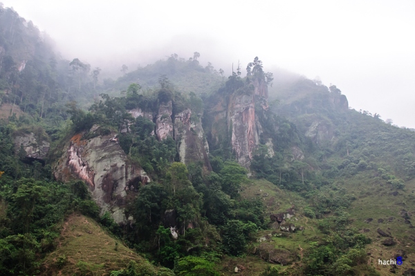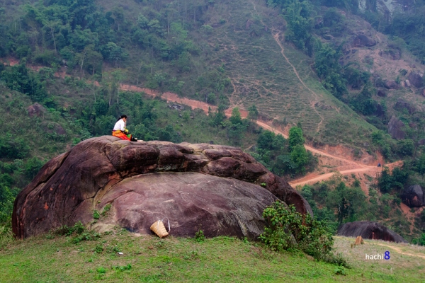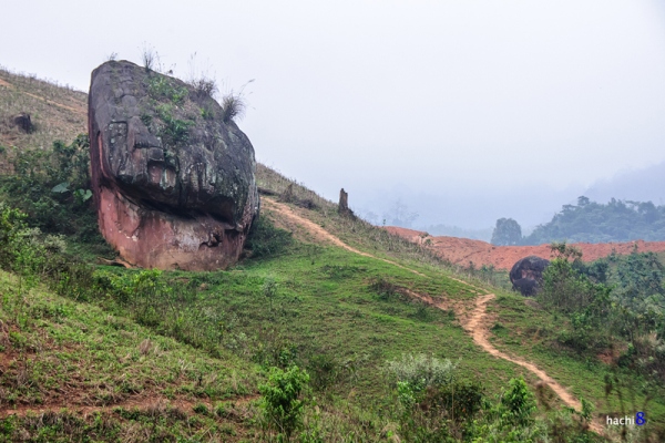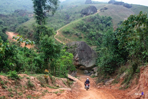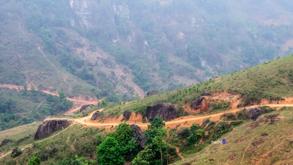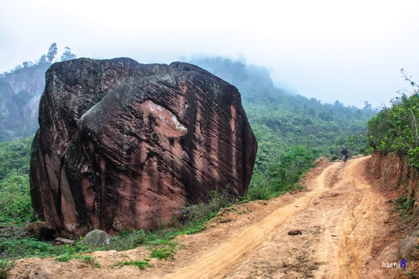 Điều đặc biệt ở đây, cũng giống như những khu vực biên giới hiểm trở với Lào mà tôi từng thấy, đó là có rất nhiều vách núi, tảng đá to chắn bên đường. Những đá tảng rêu phong với đủ hình dáng bên núi, bên đồi hay dưới suối, chắn ngang đường khiến tôi thích thú. Trông chúng giống như bay từ một vụ nổ thiên thạch và có từ hàng trăm triệu năm vậy.
