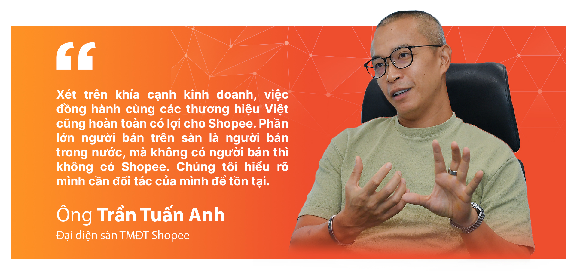 Với chủ đề này, chúng tôi đã có cuộc trao đổi với người ông Trần Tuấn Anh - đại diện sàn TMĐT hiện có thị phần lớn tại Việt Nam là Shopee về cách thức mà đơn vị này đang thực hiện để trợ lực cho doanh nghiệp trong nước đứng vững trong kỷ nguyên chuyển đổi số, tiến tới mở rộng phạm vi phủ sóng của hàng Việt ra thị trường nước ngoài.