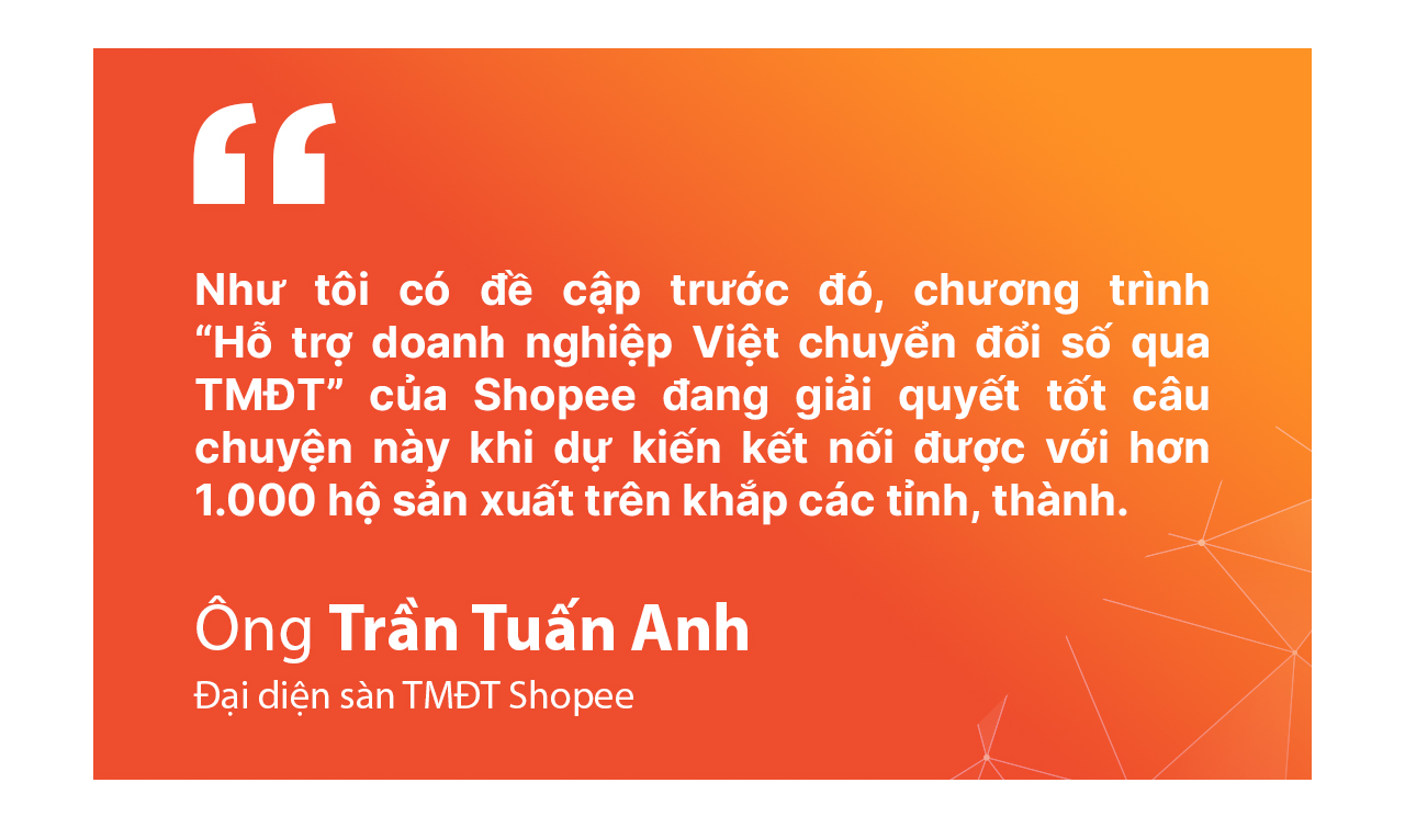 Như tôi có đề cập trước đó, chương trình “Hỗ trợ doanh nghiệp Việt chuyển đổi số qua TMĐT” của Shopee đang giải quyết tốt câu chuyện này khi dự kiến kết nối được với hơn 1.000 hộ sản xuất trên khắp các tỉnh, thành. Người sản xuất cứ tập trung vào sản xuất, còn chúng tôi lo vấn đề vận hành cũng như quảng bá sản phẩm ra thị trường, và đã được những kết quả rất tốt. Hằng tháng, mỗi doanh nghiệp có thể cung ứng đến 250.000 đơn vị sản phẩm cho chúng tôi, phản ánh tiềm lực sản xuất cũng như sức mua mạnh mẽ của người dùng TMĐT. Đáng nói là từ chỗ phải ủng hộ, đến nay hàng Việt thuyết phục khách hàng bằng cách cải thiện chất lượng, mẫu mã. Các mặt hàng thiết yếu do doanh nghiệp Việt sản xuất đang đóng vai trò nòng cốt trong chuỗi cung ứng và có mặt rộng rãi trên Shopee.