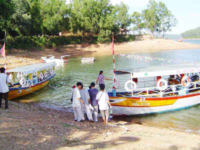 Du khách xuống tàu đi tham quan hồ Phú Ninh |