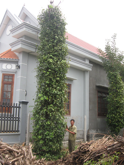 Trong “phủ” của anh Thắng có cây tiêu 22 năm tuổi, cao gần 20 mét, thuộc dạng ''lão" nhất (ảnh), chỉ một lần hái đã được 25 kg tiêu và liên tục đạt năng suất 6 năm liền. Anh cho biết, cây tiêu này là giống tiêu Vĩnh Linh có nhiều đặc tính đạt chuẩn, như: hạt to, vỏ mỏng, độ cay nồng cao…
