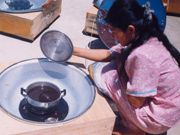 Johannes (phải) đang biểu diễn nấu nước bằng năng lượng mặt trời. |