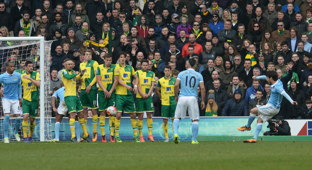 ![]() Aguero thực hiện quả đá phạt đưa bóng thẳng về khung thành Norwich khiến thủ môn Ruddy phải trổ tài cản phá
