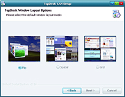 Ở cửa sổ TopDesk Windows Layout Options xuất hiện trong quá trình cài đặt, bạn đánh dấu chọn 1 trong 3 kiểu Flip, Spatial hoặc Grid với hình mô phỏng hiệu ứng chuyển đổi cửa sổ hiển thị bên trên, rồi bấm Next.