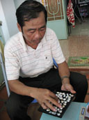 Ông Võ Văn Doi, chủ cơ sở ngọc trai Quỳnh Nga ở thị trấn An Thới với số ngọc trai nhiều hình dáng |