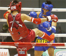 | Võ sĩ Nguyễn Trần Duy Nhất (xanh) mang HCV thế giới Muay về cho VN - Ảnh: Huy Tường |