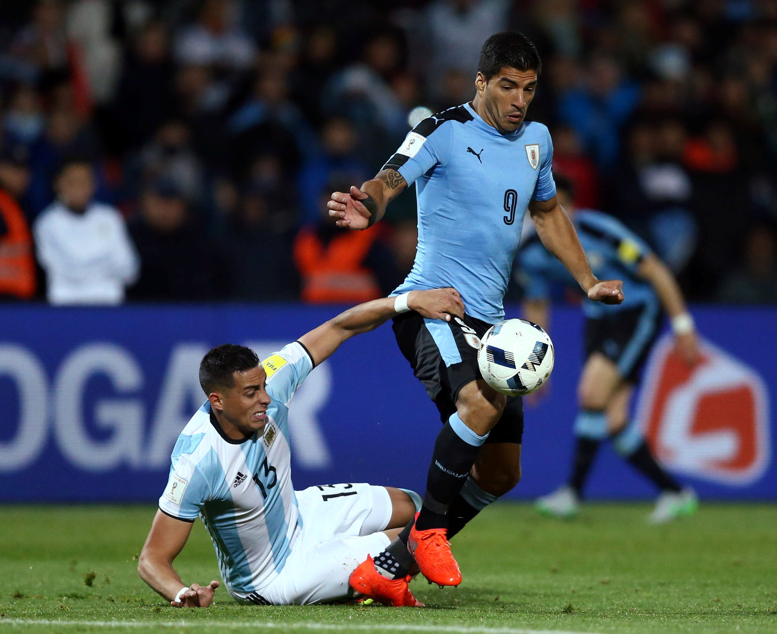 Suarez di chuyển rất rộng trên hàng công của Uruguay nhưng anh chưa thể xuyên thủng được hàng thủ của Argentina - Ảnh: Reuters