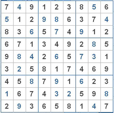 Điền vào các ô còn trống sao cho mỗi hàng, mỗi cột và mỗi miền đều chứa 9 con số (không lặp lại) từ 1 đến 9.