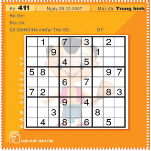 Danh sách trúng thưởng và lời giải Sudoku kỳ 411 sẽ được đăng trên Thanh Niên số 2 ra ngày 2.1.2008.