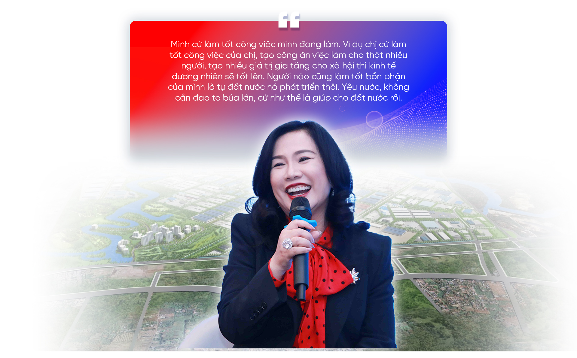 Cũng như cái quan niệm giản dị nhưng càng ngẫm càng thấm thía: "Mình cứ làm tốt công việc mình đang làm. Ví dụ chị cứ làm tốt công việc của chị, tạo công ăn việc làm cho thật nhiều người, tạo nhiều giá trị gia tăng cho xã hội thì kinh tế đương nhiên sẽ tốt lên. Người nào cũng làm tốt bổn phận của mình là tự đất nước nó phát triển thôi. Yêu nước, không cần đao to búa lớn, cứ như thế là giúp cho đất nước rồi".