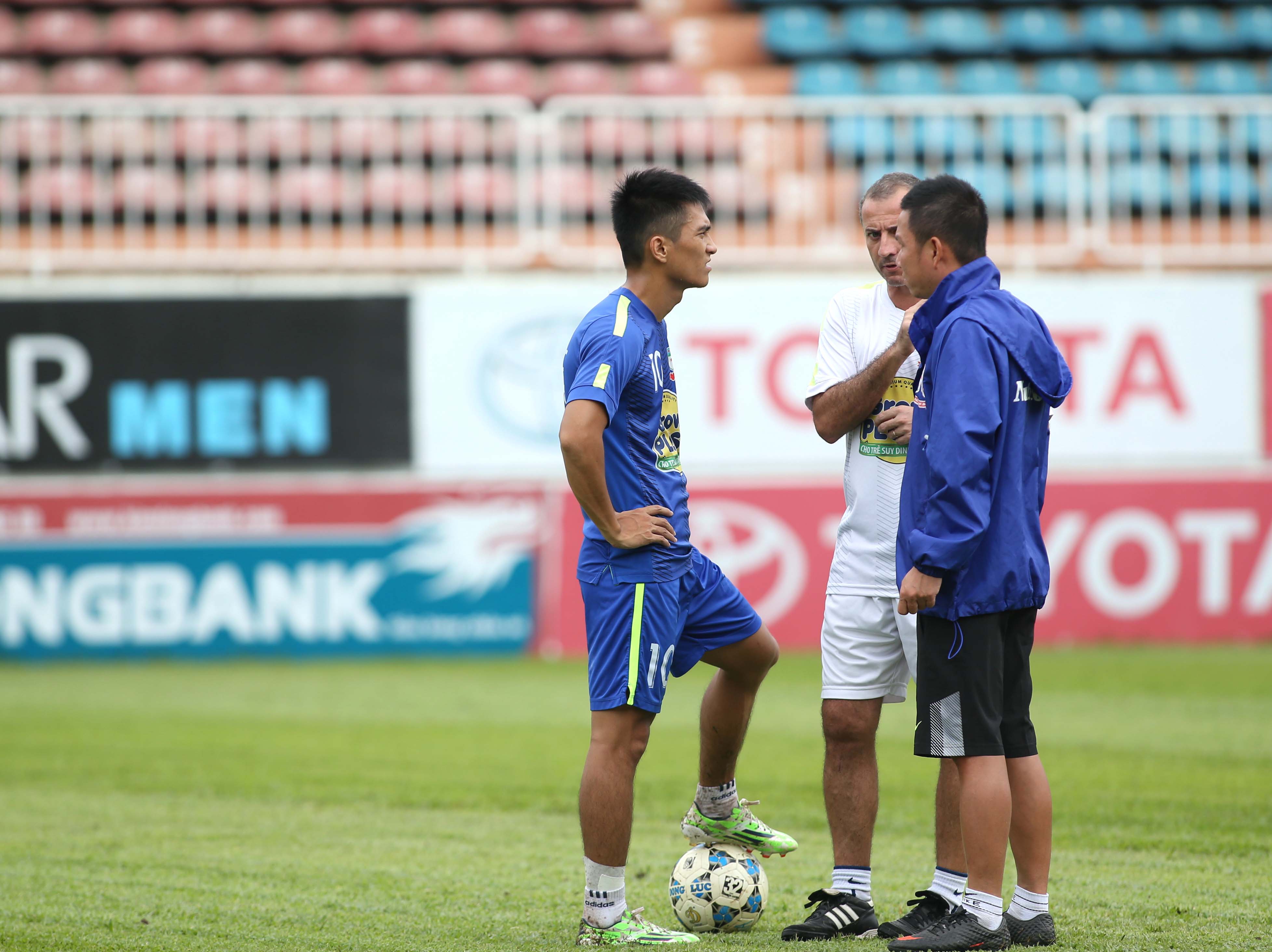 Bên phần kia sân, HLV Guillaume Graechen và người trợ lý ngôn ngữ đang nói chuyện cùng Hoàng Thiên. Cầu thủ số 10 của HAGL đã phải nghỉ một thời gian dài vì chấn thương. Nhìn vào hàng công hiện tại của đội, người phố Núi đang nhớ anh hơn bao giờ hết