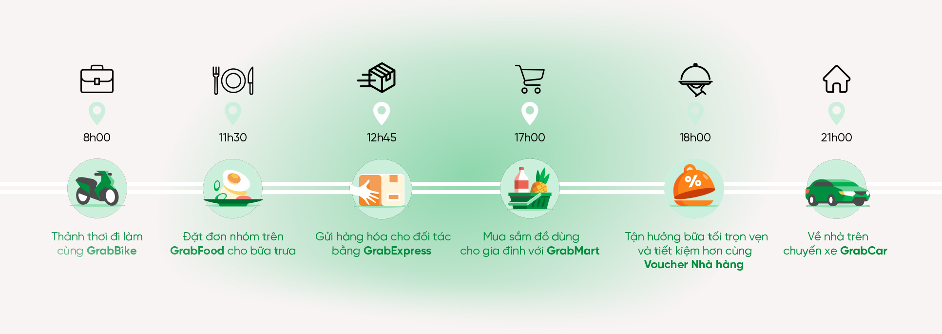 Từ đây, lần lượt dịch vụ GrabTaxi, GrabBike và GrabCar ra đời như lời giải cho những khó khăn khi di chuyển của người dân. Hành khách có thể biết trước giá tiền họ phải chi trả và lộ trình chính xác cho từng chuyến xe, trong khi đối tác tài xế Grab được đào tạo bài bản để sẵn sàng “chuyển đổi số”, có quy chuẩn phục vụ hành khách, có nhiều cuốc xe hơn nhờ nền tảng Grab, qua đó gia tăng cơ hội thu nhập cũng như cải thiện sinh kế.