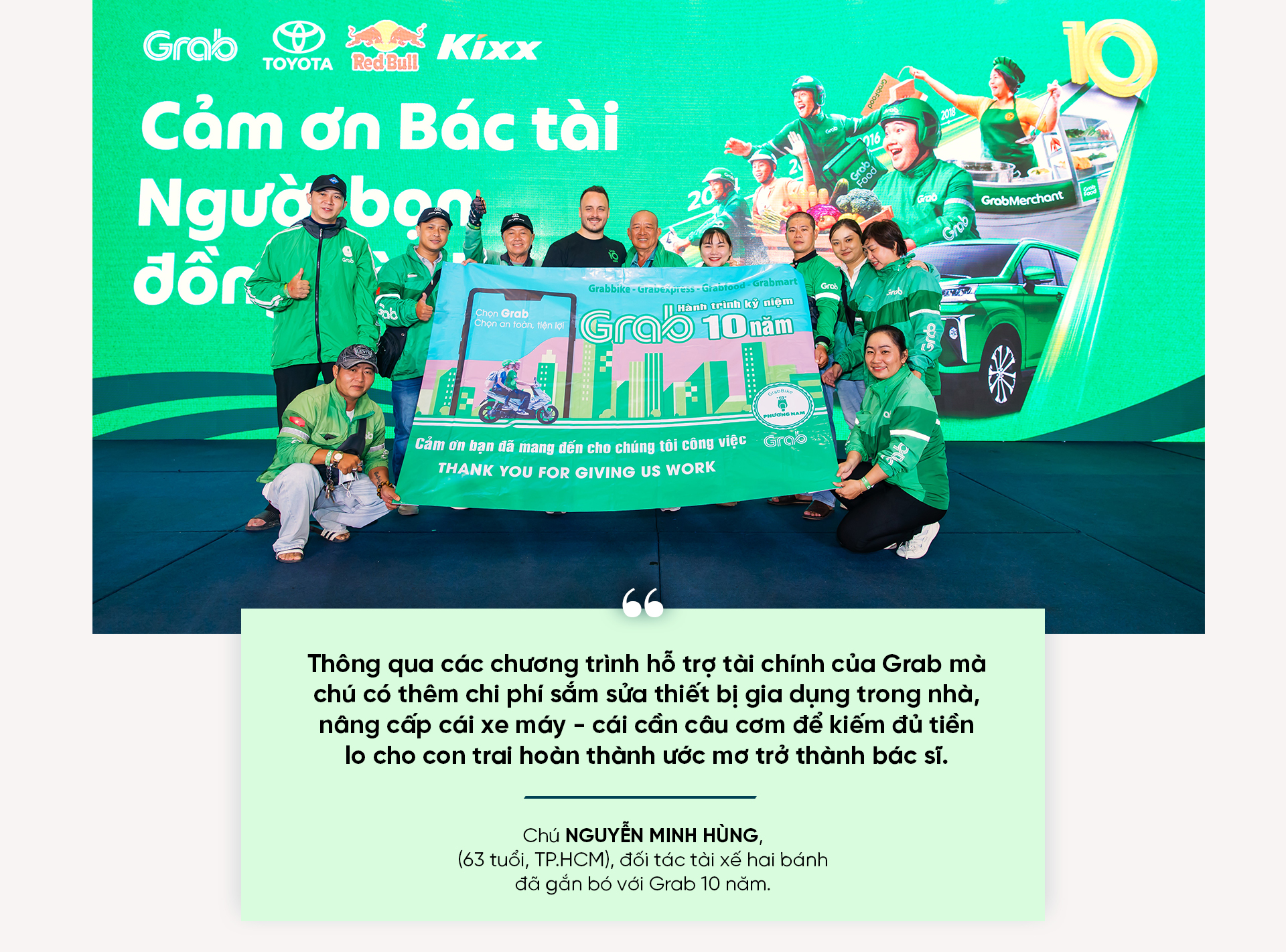 Ngoài đồng hành “trên từng cây số”, Grab đã sát cánh với các đối tác tài xế trong mọi thời điểm. Điển hình phải kể đến chương trình “Chung tay vượt khó” dành riêng cho Đối tác Tài xế tại các khu vực bị ảnh hưởng bởi bão Yagi, hay chương trình “Điều ước sau tay lái” nhằm giúp các bác tài khó khăn thực hiện mong ước của họ. Đặc biệt, Grab đã triển khai chương trình “Nữ đối tác tài xế Grab” với mục đích đào tạo chuyên biệt các chủ đề, nhằm giải quyết các vấn đề phổ biến cho đối tác tài xế nữ.