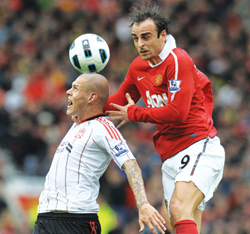 | Pha đánh đầu ghi bàn của Berbatov đem chiến thắng về cho M.U - Ảnh: Reuters |
