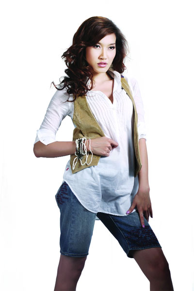 Quần short jeans xanh kết hợp áo sơ mi rộng và áo khoác ghi-lê màu beige mang đến cho Anh Thư vẻ hoạt bát, trẻ trung (hình 1).