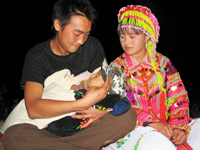 Ở ngay góc miếu Ông là các đôi nam nữ của xã Sơn Vỹ và xã Niêm Sơn, huyện Mèo Vạc. Chị Lù Thị Dâu, Chủ tịch xã Sơn Vỹ người to, chắc đậm vẫn cất tiếng hát thanh như gió núi. Chị người dân tộc Tày, 38 tuổi, đi hát từ năm 16, hầu như năm nào chị cũng đến Khau Vai. Chị Dâu dịch cho tôi nghe những câu hát theo làn điệu hát cọi, hát iếu của người Tày.