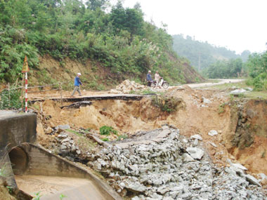 Mưa lớn trong những ngày qua đã làm tuyến đường giao thông Trà Bồng- Tây Trà bị sạt lở nhiều đoạn, nền đường bị lún sụt sâu cả mét