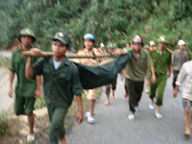 Trước đó, lúc 7h ngày 6.11, lực lượng tìm kiếm cũng đã phát hiện được thi thể của anh Nguyễn Đức Tâm, nhân viên Trạm viễn thông Bình Sơn bị kẹt trong kẻ đá dưới suối, cách hiện trường hơn 400mét. Ngay lập tức thi thể anh Tâm được khiêng về Trà Bồng để chuyển lên xe về quê nhà