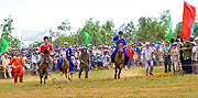 Cuộc đua ngựa ở gò Thì Thùng vào sáng mùng 9 tháng giêng năm Mậu Tý tưng bừng khai diễn với sự tham gia tranh tài của 32 kỵ sĩ. Trang phục thi đấu của các nài ngựa rất đơn sơ. Có người không dép, không giày, đầu chẳng đội mũ mà chỉ vận bộ quần áo mong manh. Sau vài lượt đua, nhiều kỵ sĩ tím tái, run bần bật bởi gió núi lạnh buốt. Ngựa cũng không thắt yên. Đã 25 năm tranh tài qua các cuộc đua ngựa, ông Võ Văn Chín (sinh năm 1948) nay là "kỵ sĩ nông dân" lớn tuổi nhất cho biết "quy chế thi" đến nay vẫn không có gì thay đổi. Các kỵ sĩ thích gì mặc đó, tự biên tự diễn. Có năm vài kỵ sĩ ngã lộn trên đường đua nhưng chưa có ai bị thương. Với lại, ngựa thắt yên thì các nài cưỡi... không quen. Đều là nông dân, tiền hạn chế nên việc mua sắm trang phục thi đấu, bảo hộ bài bản dường như chẳng ai nghĩ tới. Những năm sau ngày đất nước thống nhất, giải thưởng của cuộc đua chỉ là một cái bình thủy kèm vài chai rượu, trên tinh thần vui xuân là chính. Cuộc đua năm nay được một đơn vị doanh nghiệp tài trợ, nhưng kỵ sĩ về nhất cũng chỉ nhận thưởng... 1 triệu đồng, sau 4 lượt đua với chặng đường dài 5 km.