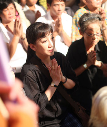 NSƯT Thanh Thanh Tâm cùng người thân đọc kinh trước linh cữu NSND Phùng Há, cầu cho bà thanh thản rời chốn nhân gian- Ảnh: Gia Tiến |