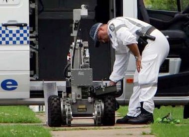 Cảnh sát chống khủng bố điều khiển robot dò bom trong cuộc truy quét hôm 8/11. Ảnh: Reuters |