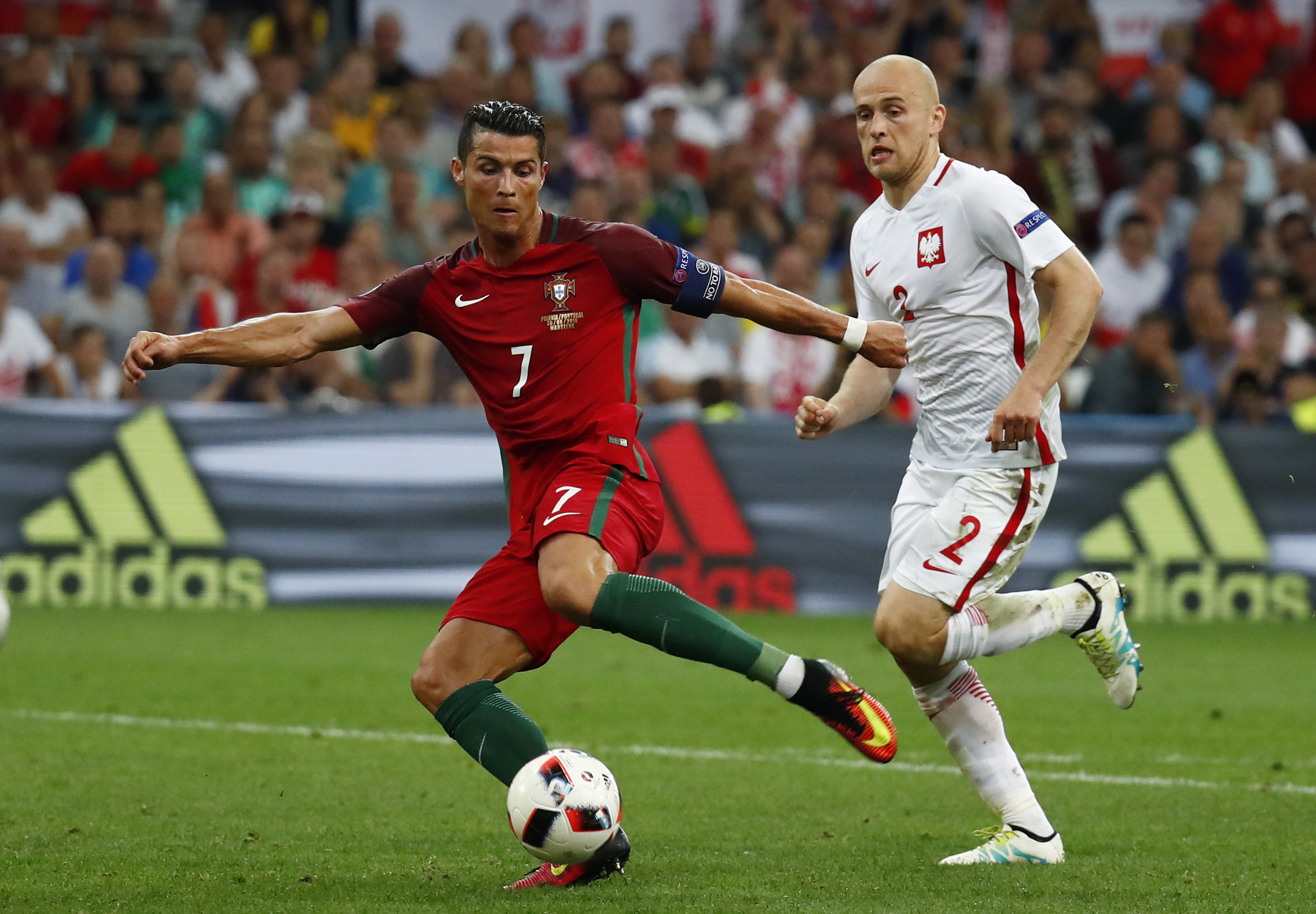 Ronaldo (trái) bỏ lỡ 3 cơ hội ngon ăn trong trận đấu với Ba Lan