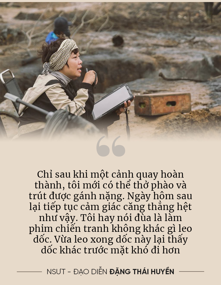 Làm phim chiến tranh không chỉ mệt về thể xác mà còn cực về tinh thần. Mỗi cảnh quay là một bài toán khó: vừa cần kỹ thuật, vừa cần cảm xúc. Áp lực nữa là đoàn phim đông gấp nhiều lần so với các đoàn phim thông thường. Bên cạnh đó là rất nhiều vũ khí, khí tài và các cảnh cháy nổ nguy hiểm. Chỉ sau khi một cảnh quay hoàn thành, tôi mới có thể thở phào và trút được gánh nặng. Ngày hôm sau lại tiếp tục cảm giác căng thẳng hệt như vậy.