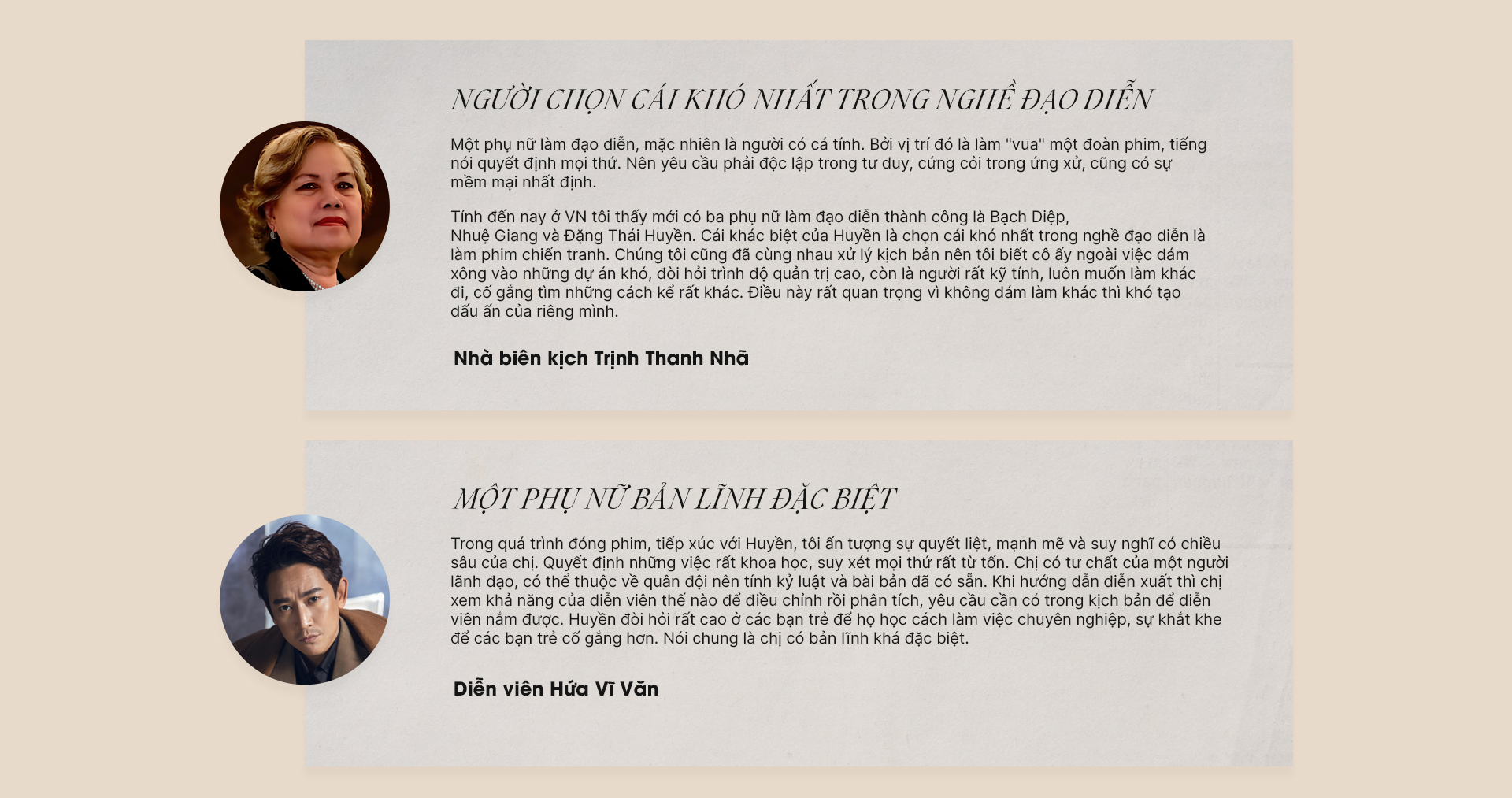 Làm nghề đạo diễn, ai cũng muốn thử sức mình ở nhiều đề tài khác nhau. Nhưng có lẽ với đề tài hậu chiến, chiến tranh cách mạng, tôi thấy mình tự tin hơn. Nói hợp cũng đúng vì mọi người biết về tôi nhiều hơn với mảng đề tài này.