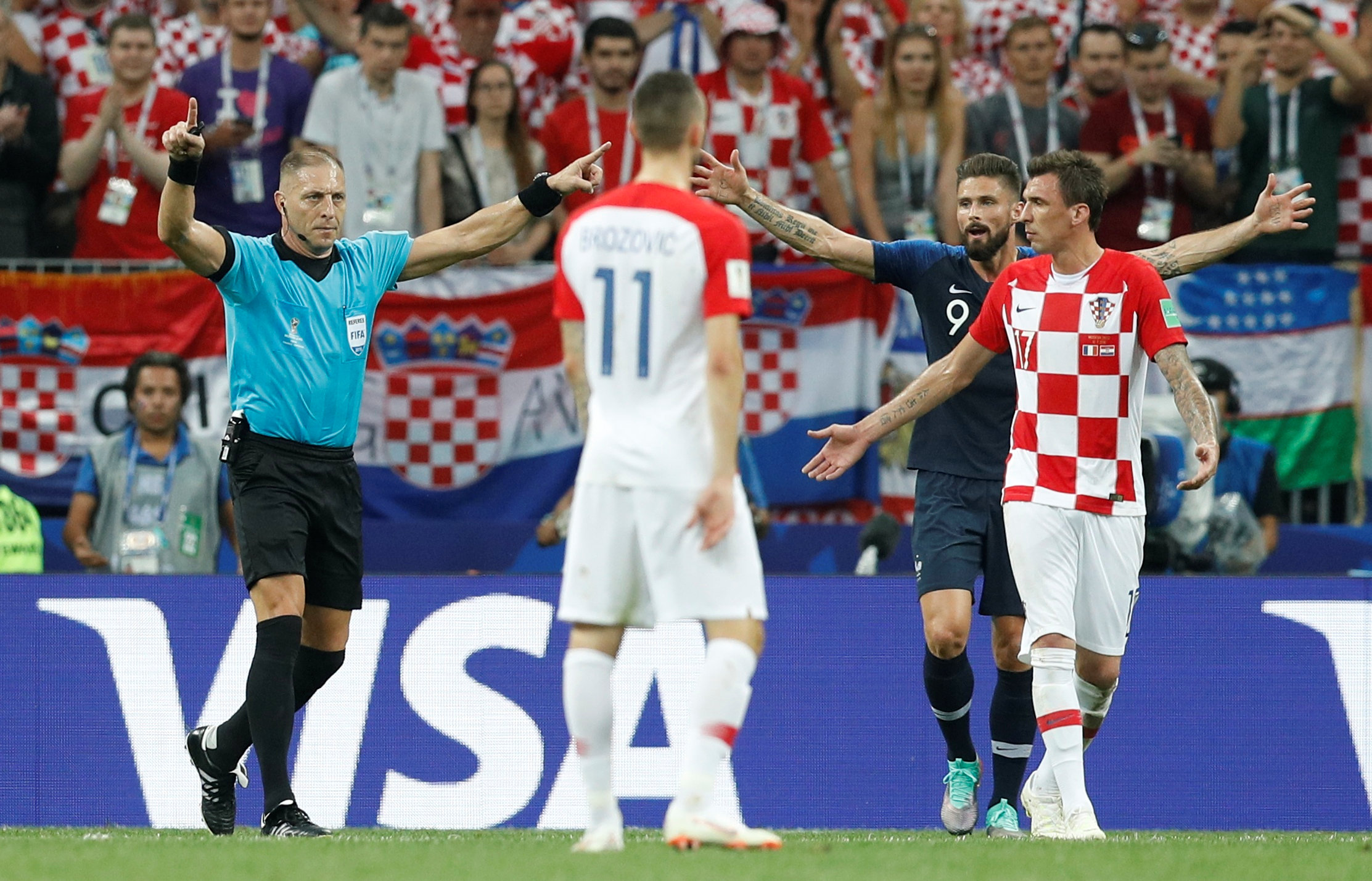 Đến cuối hiệp 1, trọng tài nhờ đến công nghệ VAR để xác định cho tuyển Pháp được hưởng một quả phạt đền