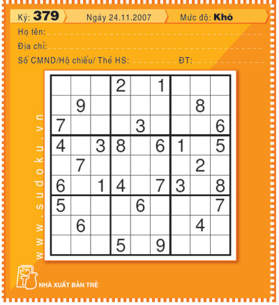 Danh sách trúng thưởng và lời giải Sudoku kỳ 379 sẽ được đăng trên Thanh Niên số 335 ra ngày 1.12.2007.