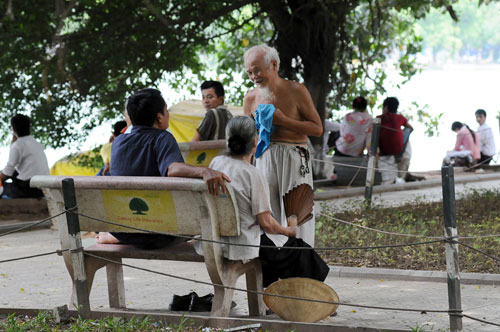 Ngồi bên bờ Hồ tránh nóng vẫn không thiếu cây quạt giấy trên tay