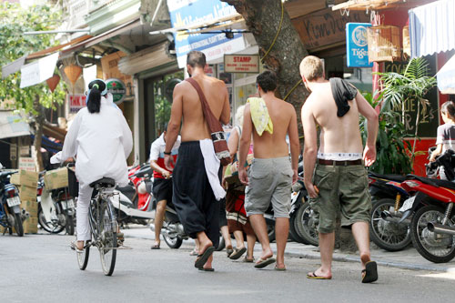 Không chỉ một mà cả ba anh Tây cũng rát người vì cái nóng oi của Hà Nội