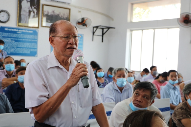 Cử tri Nguyễn Bạch Đằng (80 tuổi), ngụ tại chung cư Thạnh Mỹ Lợi, P.Thạnh Mỹ Lợi, TP.Thủ Đức (TP.HCM) nêu ý kiến tại hội nghị vào ngày 12.5 Thanh Vương