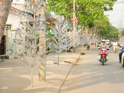 Trên đường Phạm Thế Hiển, đoạn đầu ở khu vực P.6, khách tham quan sẽ choáng ngợp với những cây thông lóng lánh bạc và đèn hoa rực sáng. Đi thêm vào con đường Noel này, cách trang trí thay đổi đa dạng với những cây bị đóng băng tuyết trắng xóa hai bên đường Phạm Thế Hiển khu vực P.7, Q.8.