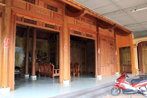 Ông Phan Khánh, xã Quỳnh Liên, H.Quỳnh Lưu, Nghệ An, sở hữu ngôi nhà gỗ cao lớn trị giá 2 tỉ đồng (chưa kể công thợ) vừa mới cất với những hàng cột gỗ lim cao vút, tự hào kể: để cất được căn nhà này, một nhóm thợ hơn 20 người thực hiện đã ròng rã ráp nối trong gần một năm với những tấm cửa, vách được chạm trổ tỉ mỉ.