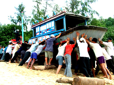 Ngư dân Phú Yên đưa tàu thuyền lên bờ tránh bão - Ảnh: Trình Kế |