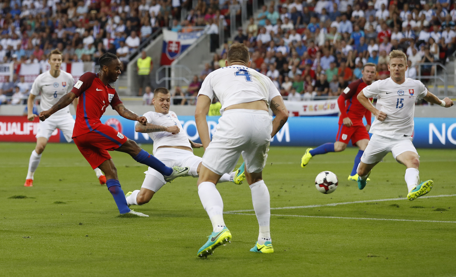 Sterling thực hiện một cú sút kỹ thuật đưa bóng vào góc cao khiến thủ môn Slovakia phải đẩy bóng đi hết biên ngang | |