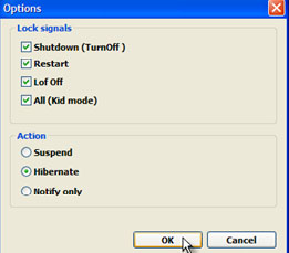 Trong khung Lock signals, bạn có thể đánh dấu kiểm chọn các hành động muốn ngăn chặn như Shutdown, Restart, Log Off hoặc đánh dấu chọn trước tùy chọn All (Kid mod) nếu muốn ngăn chặn tất cả các hành động trên và cả những hành động như Hibernate, Stand By…