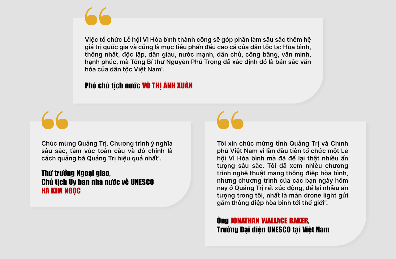 “Lễ hội Vì Hòa bình đã tác động đến cả những người buôn thúng bán mẹt, đến cả bác xe ôm, đến bà bán nước giải khát vỉa hè... để họ có thêm công ăn việc làm, tạo nguồn thu cho bản thân họ và giảm bớt áp lực cho chính quyền về việc làm, về tiêu thụ các sản phẩm nội địa. Đây là những bước đi rất dài để hình thành Quảng Trị là 1 điểm đến hòa bình”, ông Nam chốt hạ.