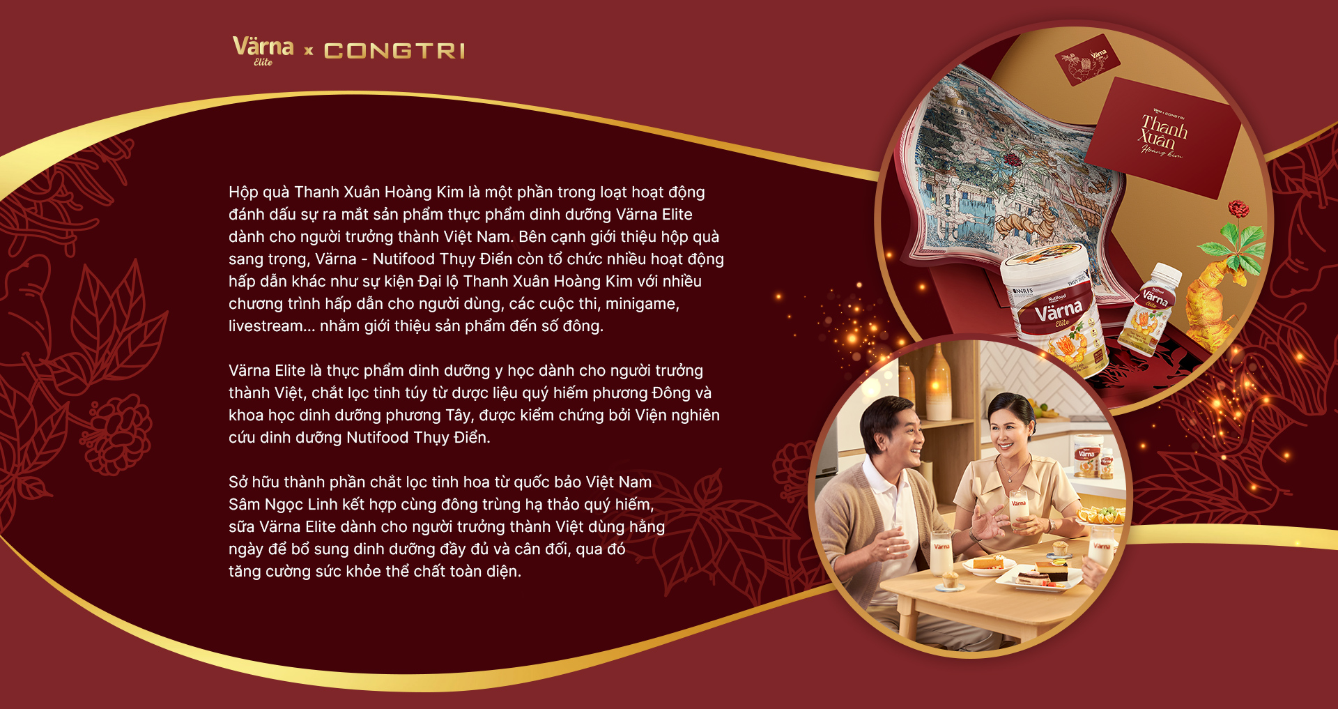 Để nâng tầm giá trị cho hộp quà, một chiếc thẻ Värna Elite Club đẳng cấp đã được đặt trang trọng giữa chiếc khăn lụa và món quà sức khỏe từ nhãn hàng Värna - Nutifood Thụy Điển với thành phần chứa Sâm Ngọc Linh và đông trùng hạ thảo quý hiếm. Chiếc thẻ là chứng nhận dành riêng cho các khách hàng sở hữu sản phẩm của Värna, mở ra cơ hội tiếp cận những đặc quyền có một không hai như voucher du lịch, vé máy bay hay sản phẩm sức khỏe…