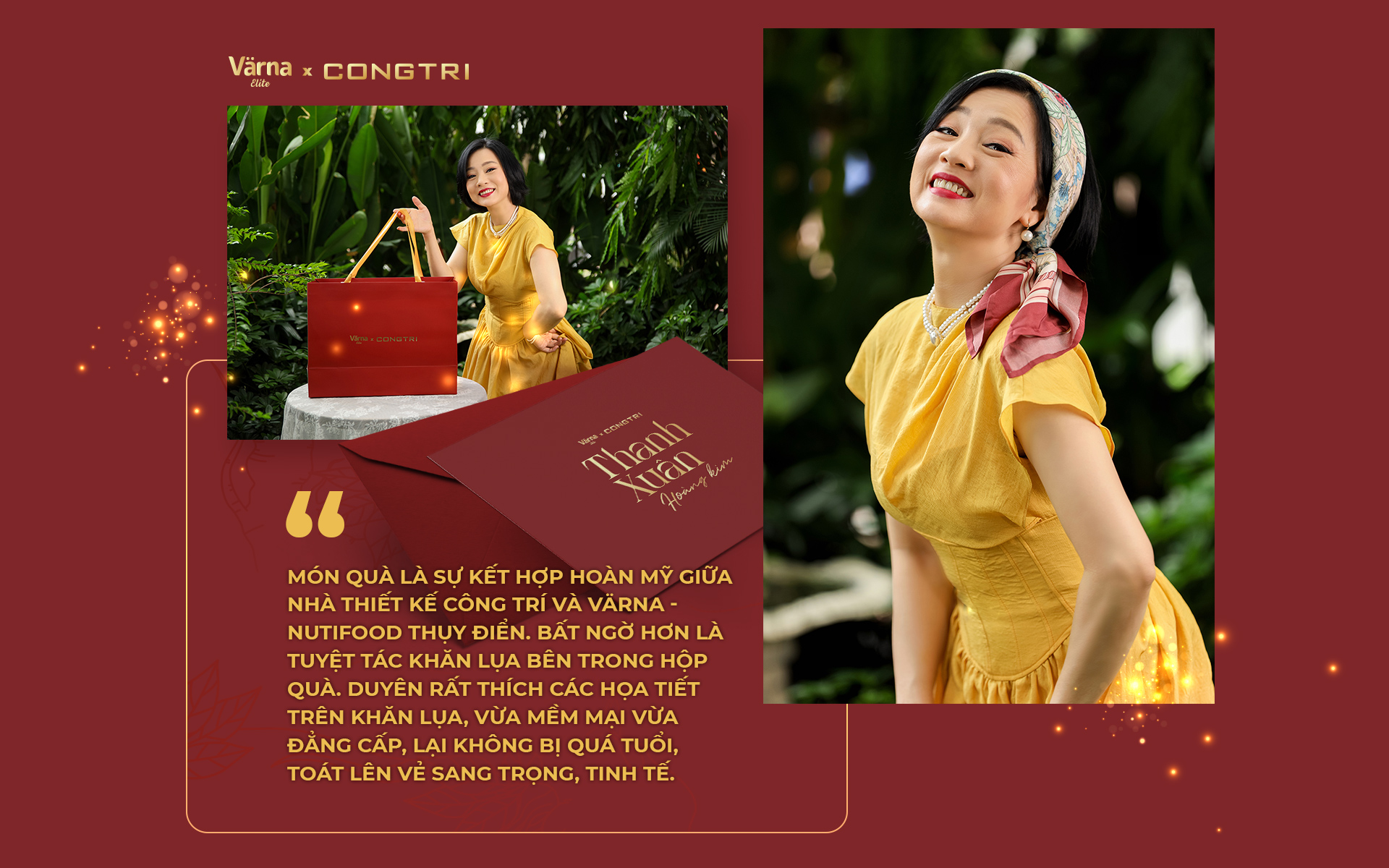 Là một trong những người đầu tiên sở hữu hộp quà "Thanh Xuân Hoàng Kim", nghệ sĩ Mỹ Duyên không giấu được sự yêu thích: "Món quà là sự kết hợp hoàn mỹ giữa nhà thiết kế Công Trí và Värna - Nutifood Thụy Điển. Bất ngờ hơn là tuyệt tác khăn lụa bên trong hộp quà. Duyên rất thích các họa tiết trên khăn lụa, vừa mềm mại vừa đẳng cấp, lại không bị quá tuổi, toát lên vẻ sang trọng, tinh tế".